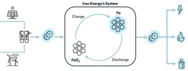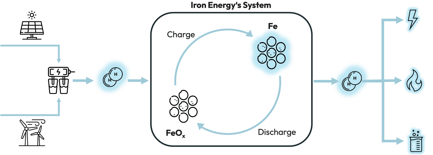 The energy of the produced hydrogen is chemically stored in solid iron using IRON ENERGY's system based on the steam-iron process.